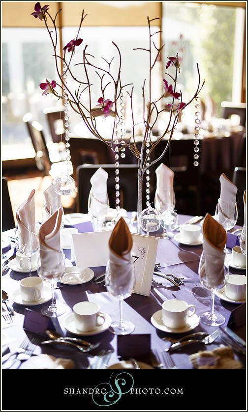 The Royal Glenora features a rock fireplace that worked as a great backdrop for Vanessa & Cody’s head table. We amped up the glamour with a custom willow branch wall piece adorned fuschia orchids and hanging glass bulbs containing tea lights
