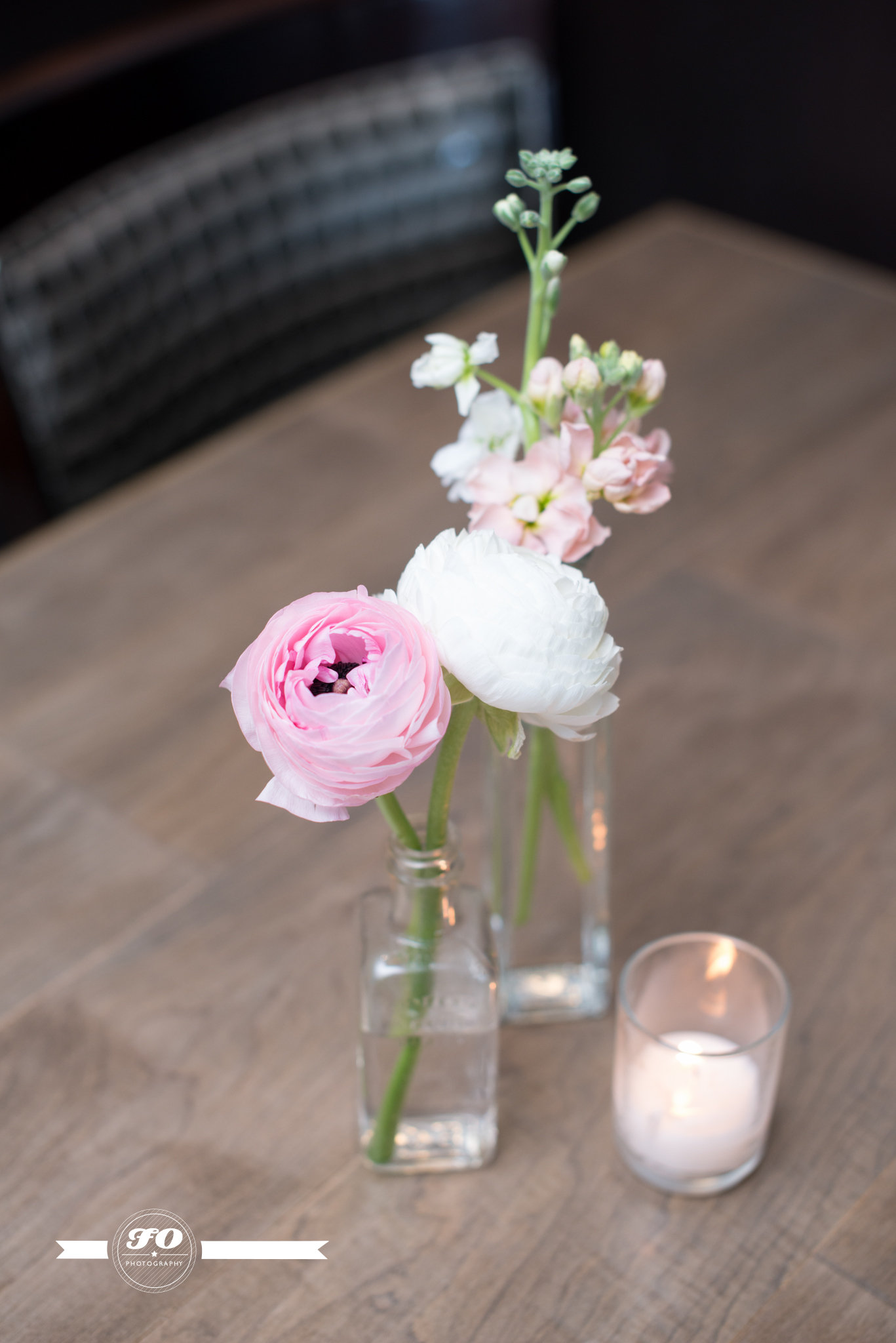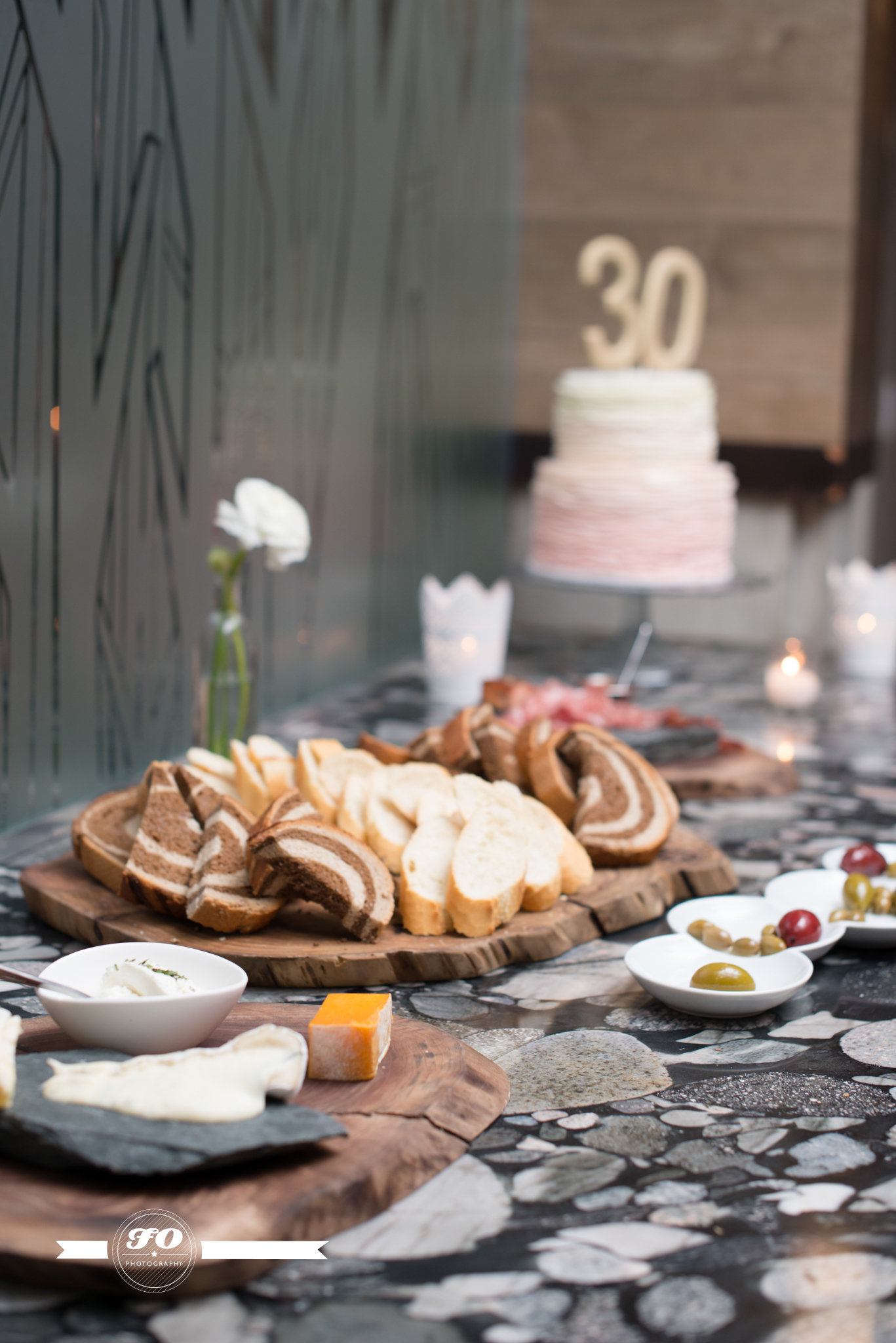 As for the decor, well, I wanted to keep it elegant and girly for my thirtieth without going over the top (of my budget). I didn’t need a whole lot, as Ampersand27‘s Mixer Room is already really nice. The color scheme in the Mixer Room is on the darker, earthier side and it contrasted beautifully with the blush and gold colour palette I chose. I kept the centerpieces simple (and affordable) with blush and white ranunculus flowers in glass vials and vases, and of course candles. I used Coconut Caress candles by PartyLite which made the room smell incredible but subtly so. I also included these tea lights in my favour jars!